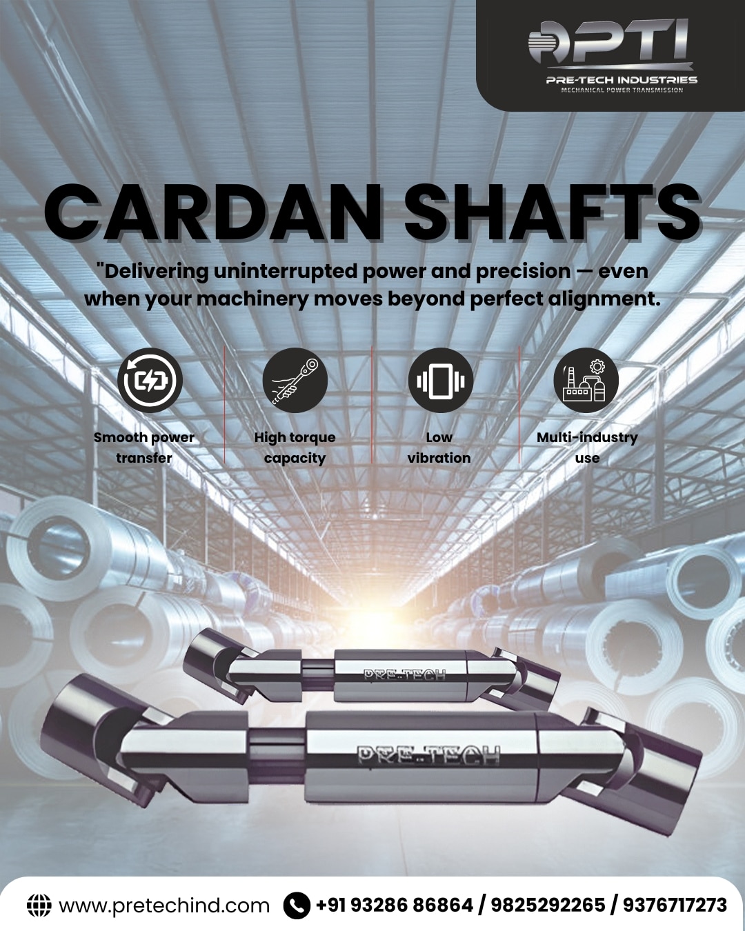 Top Cardan Shafts Manufacturers in Ahmedabad, Gujarat, India. At Pre-Tech Industries, we specialize in delivering high-performance Cardan Shafts designed for superior torque transmission and reliability. Known for their exceptional durability, our shafts are a vital component in both automotive and industrial systems, where precision and performance matter most. A Cardan Shaft, also known as a driveshaft, is a mechanical device that transmits torque and rotational motion between two shafts that are not perfectly aligned. It effectively compensates for angular deflection and distance variation, ensuring smooth and consistent power transfer even under dynamic operating conditions. Built with robust materials and cutting-edge technology, each Cardan Shaft features universal joints, a slip joint, and a precision-balanced tube, making it ideal for demanding environments where stability and alignment are crucial. Core Functions and Advantages 1. Torque and Motion Transmission The primary role of the Cardan Shaft is to transfer power from the driving component (such as a gearbox or motor) to the driven component (like an axle or roller). It ensures uninterrupted torque delivery with minimal vibration or energy loss. 2. Misalignment Compensation Through the use of universal joints, the shaft efficiently handles angular or parallel misalignments, preventing mechanical stress and ensuring long service life. 3. Distance Variation Handling The built-in slip joint allows the shaft to adjust its length dynamically—particularly important in automotive suspension systems and industrial machinery where the distance between components changes during operation. Technical Specifications • Category: Spline / Flange Joint • Shape: Round • Usage/Application: Automotive Industry & Heavy Machinery • Material: High-grade alloy steel • Features: High strength, dimensional accuracy, seamless finish • Country of Origin: Made in India • Availability: In Stock Each Cardan Shaft is meticulously manufactured and tested under the supervision of skilled professionals, ensuring adherence to international standards for safety, durability, and precision. Applications of Cardan Shafts Our Cardan Shafts are widely used in: • Automotive Industry: Connecting the transmission to the rear axle in vehicles. • Industrial Machinery: Used in rolling mills, steel plants, paper mills, and shipbuilding where power must be transmitted between misaligned shafts. • Heavy Equipment: Ideal for construction machines, conveyors, and hydraulic presses that demand constant power flow under varying load conditions. Why Choose Pre-Tech Industries? With years of expertise and advanced manufacturing capabilities, Pre-Tech Industries stands among the most reliable Cardan Shaft manufacturers and suppliers in India. Our focus on innovation, strength, and precision engineering enables us to deliver components that enhance efficiency and reduce maintenance costs. We offer customized Cardan Shaft designs with Spline and Flange Joints to meet diverse operational requirements—backed by responsive support and quick delivery. When it comes to power transmission solutions, Pre-Tech Industries ensures performance you can trust. Whether you’re in the automotive, steel, or marine industry, our Cardan Shafts deliver the strength, accuracy, and balance your machinery deserves.